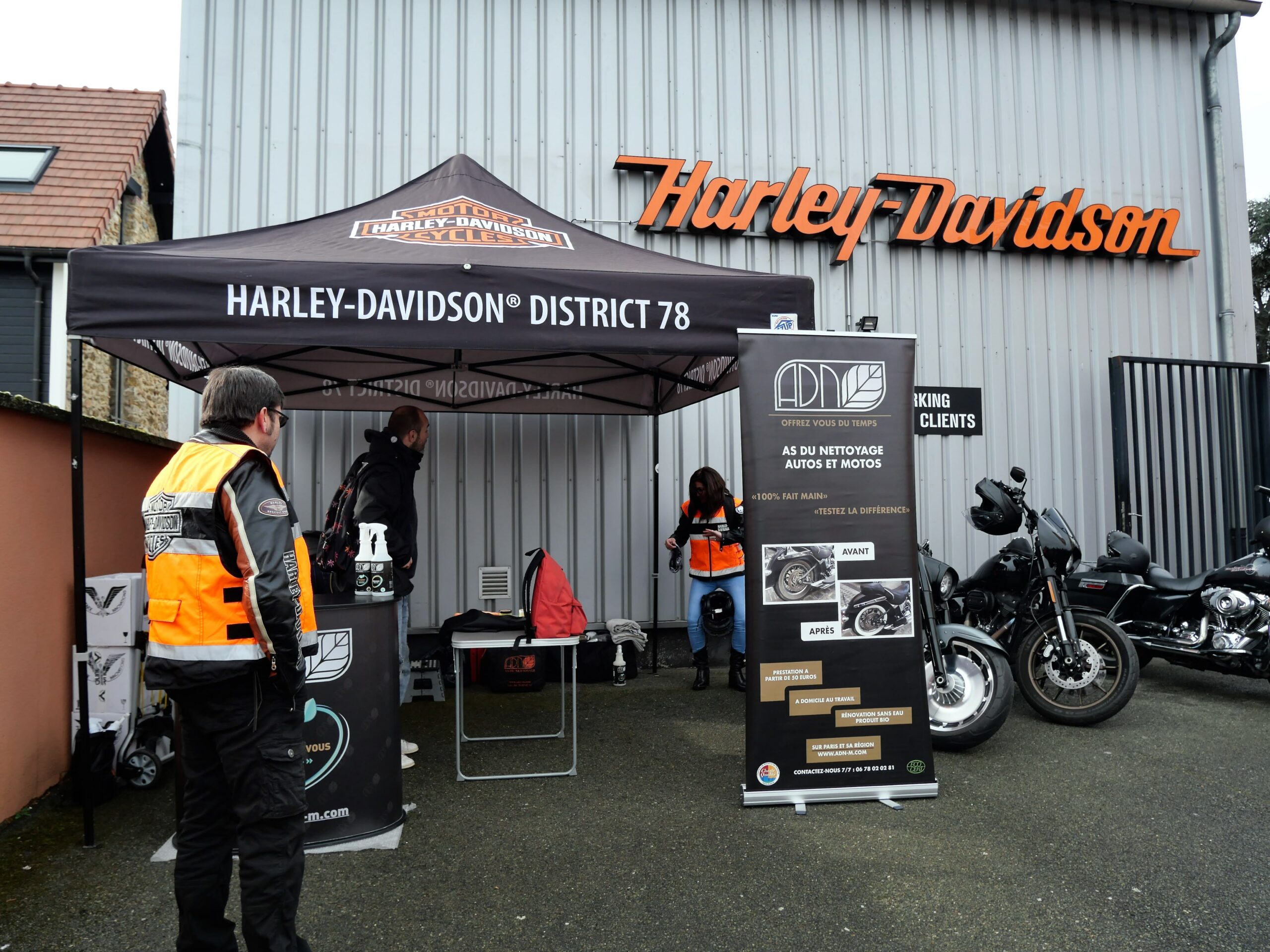 8h30, les premiers arrivés balisent de stationnement des motos attendues, car il y en a du monde de prévu !