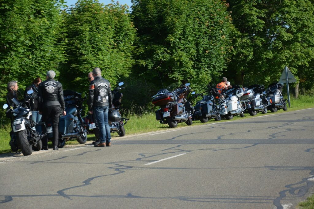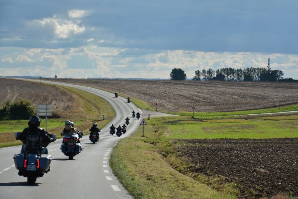 Nous sillonnons la campagne pour arriver à Heilles, à l’auberge des tilleuls où le chef nous a concocté un délicieux repas. Souriants et repus (Les profiteroles à la pistache étaient succulentes), nous improvisons la photo du drapeau sur une aire de jeux pour enfants sous les regards amusés de quelques badauds (notre photographe est des plus créative !!!). L’après-midi nous voit traverser Rome, Détroit et nous faisons même la course avec une poule (course remportée haut la main par nos Vtwins surpuissants). Les petites routes et leurs virages défilent au milieu de très beaux paysages. On croyait bien connaitre ce département mais il nous a réservé de très belles surprises.
