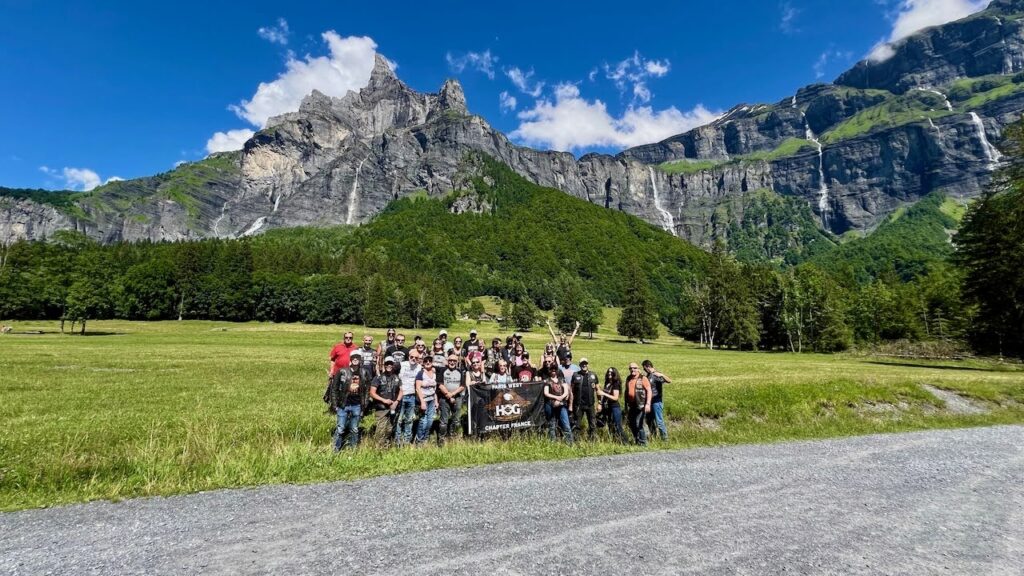 Samedi 13, dernière journée sur site. Direction le barrage d’Emosson pour ceux qui le souhaitent, déjeuner protocolaire pour le directeur et l’assistant directeur avec les officiels du HOG et pour les autres, balade sur le site du festival. Nous serons donc 13 (10 motos) à partir en direction du barrage.