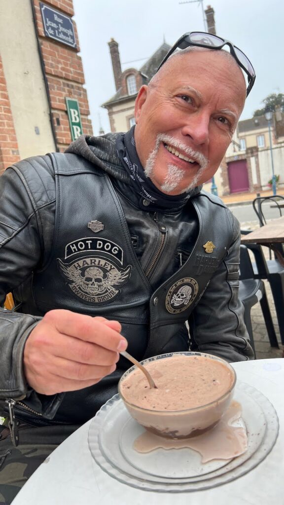 Dès le départ, sous un frais soleil, les paysages des Yvelines et du Perche défilent, les virages s’enchainent et la pause petit déjeuner arrive à point nommé à la minute près (toujours le timing). Nous réveillons gentiment le village de la Ferté Vidame pour nous poser au Bar à vin. Là notre hôte(esse) nous accueille de la meilleure des façons avec de la brioche fraiche et un petit café maison ; Bertrand a même le droit à un énorme bol de chocolat.