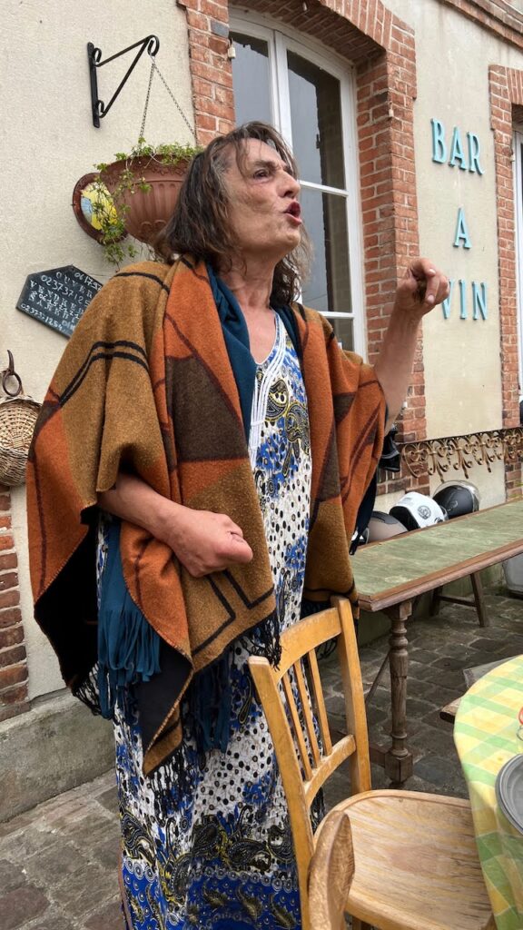 Mais ce lieu recèle bien d’autres pépites : une petite salle derrière le bar où diverses antiquités attendent sagement le chaland, des toilettes un peu rustiques qu’on ne trouve qu’en suivant les petits lapins bleus (on vous laissera chercher pour la chasse d’eau) mais le plus important est notre hôte(esse), un personnage solaire et rayonnant qui nous offre une interprétation de l’homme à la moto de Piaf tout à fait exceptionnelle ; une très belle rencontre.