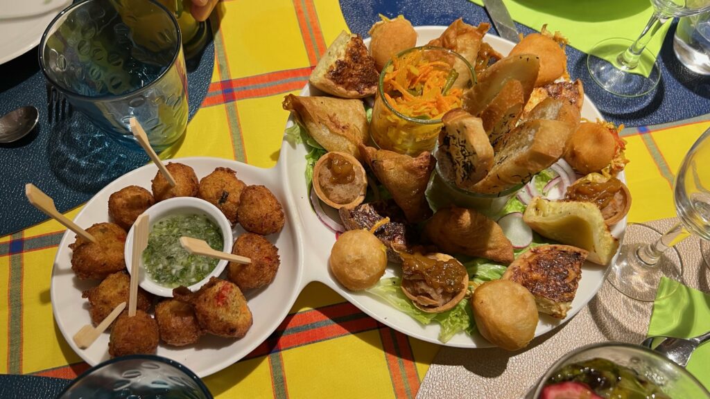 Cocktail apéritif créole ; ti-punch, punch coco, planteur, ou cocktail de fruits exotiques et Plateau d’entrées à partager, composé de : Accras de Morue, samoussas légumes, boudins créoles, madeleine curry vert et coco,