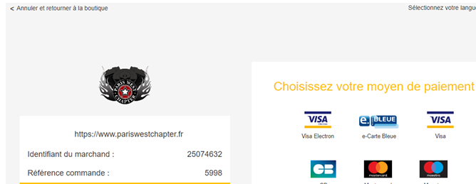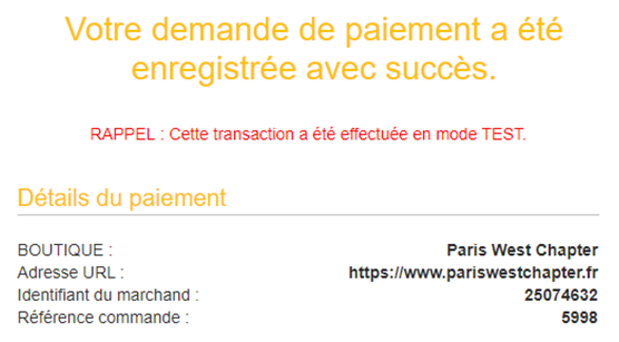 Confirmation de la commande et du paiement sur le site du Paris West Chapter