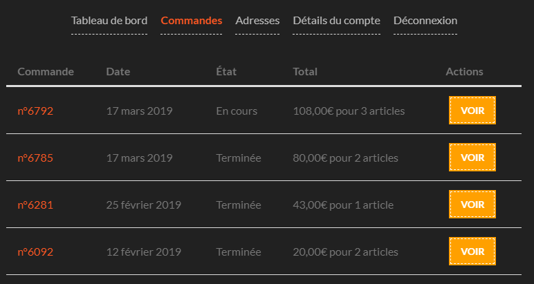 menu Mon compte La rubrique [Commandes] vous permet de visualiser toutes vos commandes :