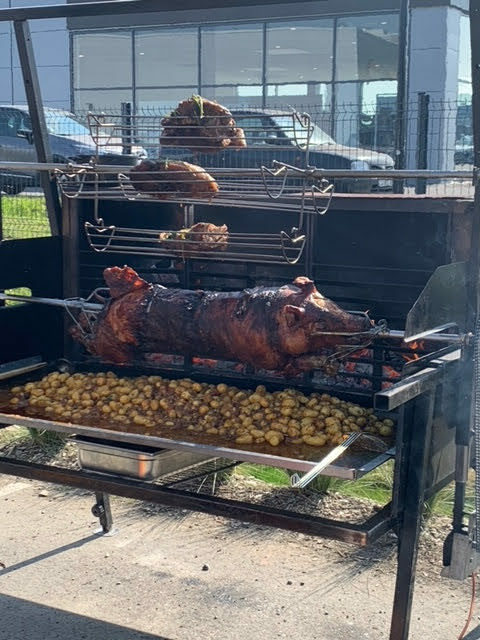 Quelques instants plus tard, une horde de 80/90 motos nous rejoint clôturant ainsi leur run et ouvrant les festivités tout en allongeant la queue pour être ravitaillé de ce magnifique et très bon cochon grillé.