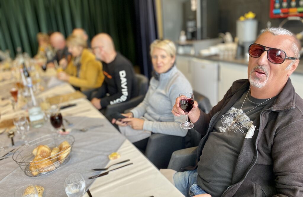 Retour à Erdeven et on embraye avec la séance apéro qui est animée par le DJ qui conduit nos bikers et bikeuses sur les airs de Madison et Macarena 😁. Un très bon diner qui se conclura autour d’une omelette norvégienne préparée par le pâtissier de la maison (imagine le bouleau pour 300 personnes ! 😁).