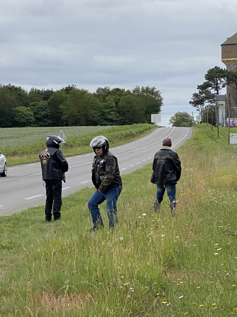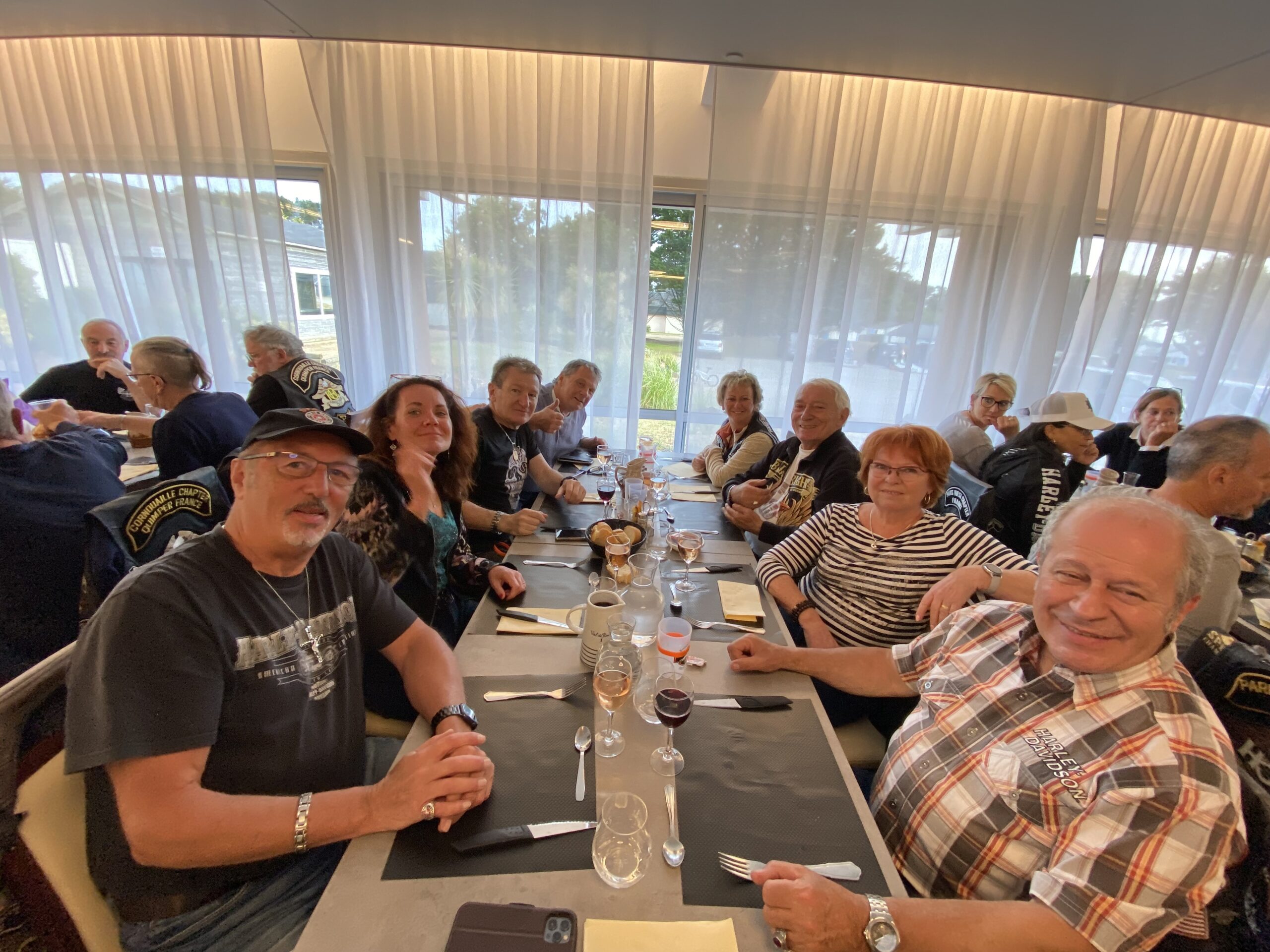 Donc, le président nous concocte un joli parcours par le Perche, la Sarthe, la Mayenne avec un stop gastronomique (Le Grand Cerf à Ernée) pour garder toutes nos forces intactes en vue d’une arrivée dans l’après-midi à Erdeven, le lieu de villégiature pour l’ensemble des participants. Quelques pauses techniques pour remplir les réservoirs et soulager nos vessies en pleine nature (on est même tombé sur un passionné Harley, qui à la vue de nos bikers se soulageant dans la nature devant chez lui, a offert aux ladies l’utilisation de ses toilettes, pas mal l’effet Harley non ? 😁.
