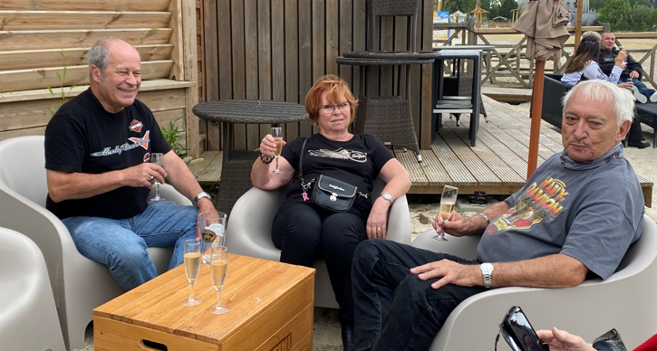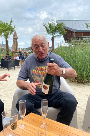 Bon voilà il nous restait une dernière mission, un déjeuner (et oui encore 😊) et mettre en orchestre les adieux (ou plutôt au revoir). Patrick avait bien prévu les choses, je dois dire. Un restaurant au bord de l’eau avec une plage de sable le tout en ville et un espace pour communiquer ses remerciements à tous et en particulier aux « safety » qui ont eu une lourde tâche pour assurer le bon déploiement de ce long convoi ! Le tout au top avec du champagne bien sûr et un beau gâteau pour le 25ème anniversaire du Reims Champagne Chapter.