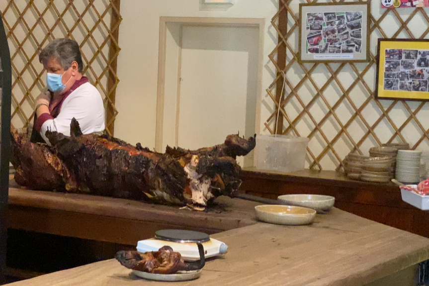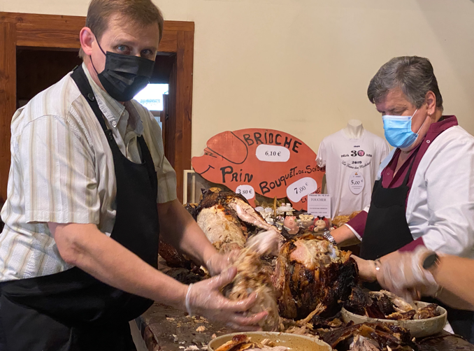 Après une bonne heure et demie de route et puis quelques arrêts imprévus pour raccrocher les wagons (bien prononcer ouagons pour nos amis belges 😊) car oui nous avons eu quelques soucis (imaginez un convoi de 125 bécanes en petite route de campagne, cela frise les 4 kms bout en bout) nous réussissons à rejoindre une autre étape mémorable pour un long déjeuner à « la ferme des Michettes » à Coucy le château où nous attendait un repas digne d’Obélix. A l’entrée de la salle de restaurant un très grand four à bois en pierre allait nous révéler après les entrées maison un cochon entier grillé pour régaler les papilles des amateurs.