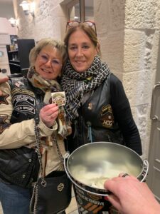 Il est 20h00 : les premières nanas arrivent à la crêperie avec +/- zéro degré et un sol glissant qui a valu une belle chute mais rien de cassé, juste un bel hématome. Un plan de table avait été préparé : des coupons aux couleurs du PWC, du HOG et de HD sont disposés dans chaque assiette par Stéphanie et DanLan.