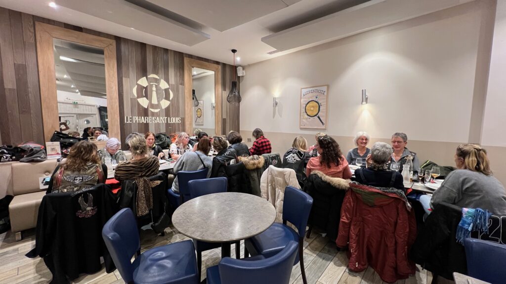 20h30 : il est temps de prendre l’apéritif : kir breton pour toutes ou soft pour les plus raisonnables. Alexandre, notre serveur de la crêperie « Le Phare Saint Louis » aux Les Clayes-sous-Bois prend les commandes : les choix sont très diversifiés (Forestière, Marlychoise, Campagnarde, Guéméné etc… etc…Les assiettes sont copieusement servies et nous passons aux choses sérieuses : se régaler avant de terminer avec une crêpe sucrée en dessert. Le tout accompagné d’un bon cidre Brut Artisanal Normand.