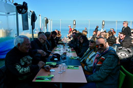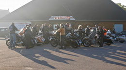 Notre road captain, après un petit détour de ville, nous emmène jusqu’au café ou en Gentleman, il a réservé des croissants à la boulangerie juste à côté. Je m’y rends avec Eric M, la tête des clients de la boulangerie et de la boulangère lorsque je demande 40 croissants « au cambrioleur !! » je crois lire sur leur visage. Tout s’arrange, on ne dévalise pas la boulangerie et rapportons à nos bikers ce précieux butin.