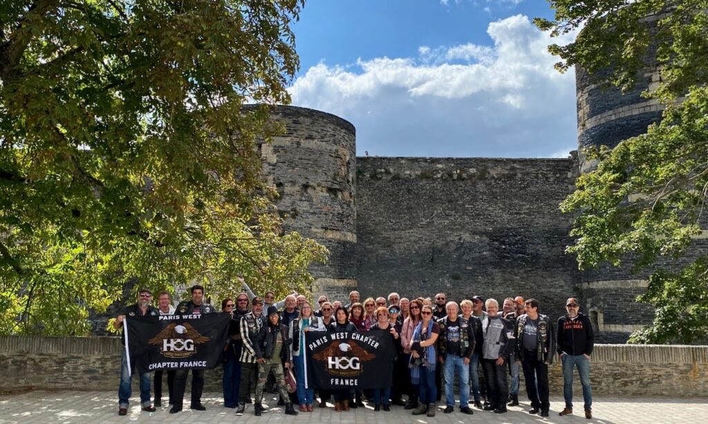 Le soleil se lève, les brumes se dissipent, la campagne est superbe. Après un peu d’autoroute, un petit déjeuner au Mac Do qui a décidé de se lancer dans le slow food ce matin et quelques virages dans la campagne mancelle et angevine, nous voici arrivé à Angers. Là d’autres amis nous rejoignent en provenance des Sables d’Olonne. Nous sommes désormais 41.