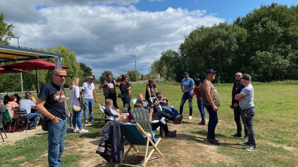 Comme on a bien roulé la veille, en ce dimanche matin, le départ est calé à 9H30. Direction les bords de Loire, l’eau étant notre fil conducteur. Après une belle ballade, pause déjeuner à la guinguette Mazette à Ecouflant où Anne et son équipe nous ont concocté un bon repas au bord de l’eau. Petit JACK et ses amis profitent de la vie et refont le monde dans les volutes de cigares. D’autres s’autorisent une petite sieste digestive. Elle est pas belle la vie ???