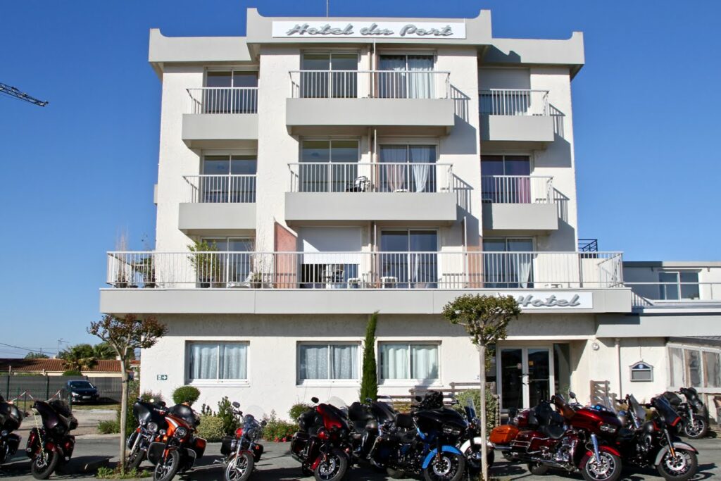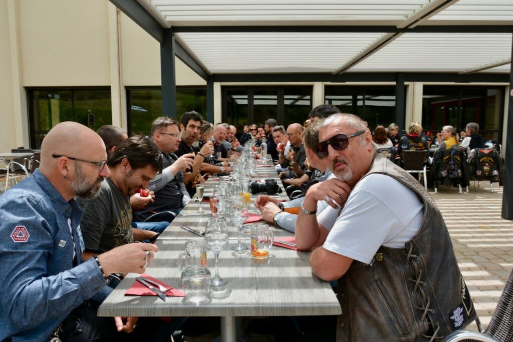 Nous arrivons à l’hôtel vers 17h00, Nathalie et Ludo (les gérants) nous accueillent chaleureusement, ravis de voir nos belles machines. Nous occupons tout l’hôtel, il y a une belle et grande piscine (qui donne envie… mais elle est à 18 !), nous filons dans nos chambres nous détendre un peu, prendre une bonne douche, UN seul courageux va se baigner : Gilbert ! On se retrouve sur la terrasse pour se désaltérer, on se détend, ça fait du bien ! Les 10 amis du Chapter de Bordeaux qui avaient souhaité nous rejoindre pour le week-end arrivent et l’apéro commence, commence, et commence encore ! Bon, après cet apéro nous passons à table. Ludo, maître restaurateur, nous a concocté de bons plats, précédés par un beau buffet d’entrées et suivi par un large choix de desserts. Et ce sera ainsi chaque soir ! Bon, il est tard, il faut aller dormir car demain on a une grosse journée !