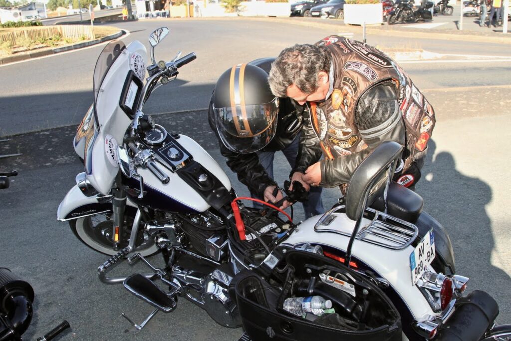 Vendredi 31 Mai : au programme cette journée : on va rejoindre le Chapter de la Rochelle qui nous a gentiment proposer une balade dans leur belle région. Nous sommes 37 du PWC plus 10 Bordelais et 33 Rochelais, 53 motos au total. Nous les retrouvons à la concession de La Rochelle où certain(e)s font un peu de shopping avant de partir pour notre run. Nous formons 2 groupes. Nous roulons le long de la côte jusqu’à Fouras (en face du Fort Boyard, on sait maintenant pourquoi le Père Fouras s’appelle ainsi ! Tout du moins moi je ne le savais pas !). La route nous emmène jusqu’aux pieds du pont qui mène à l’Ile d’Oléron. Nous déjeunons là avant d’aller faire un tour sur l’île. Et c’est là que les ennuis mécaniques ont commencé : chez nous, Thierry B a des problèmes de batterie, mais heureusement notre ami Bruno de Bordeaux a un booster et lui permet de redémarrer, on lui changera sa batterie une fois rentrés à la concession en fin de journée. Et, plus grave, Dominique de Bordeaux a serré son moteur, la moto est immobilisée à Boyardville où nous nous étions arrêtés pour une petite glace et boisson fraîche. Alors que certains essaient de joindre l’assistance ou un dépanneur nous lançons un petit « madison » auquel se joignent des passants ! Un vrai flashmob avec spectateurs et applaudissements ! Quel succès ! Moins de succès par contre pour les tractations avec les dépanneurs car aucun n’est prêt à venir, un vendredi de l’Ascension, sur l’Ile d’Oléron, chercher la moto en panne ! A noter : ne jamais tomber en panne sur l’Ile d’Oléron, et encore moins un jour de pont ! Le pauvre Dominique retournera à Bordeaux avec la moto de sa femme pour chercher son fourgon et il dépannera sa moto lui-même le lendemain ! Fin du week-end pour eux 2, nous en sommes désolés ! Pas d’autre ennui à déplorer, nous rentrons à la concession où nous quitterons non sans les remercier, nos amis Rochelais pour cette belle journée !