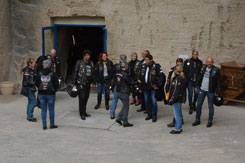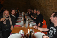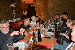 Une petite pause-café à Illiers-Combray après Chartres, nous reprenons la route vers Doué-la-Fontaine où le déjeuner est prévu. Nous arrivons dans une zone type zone industrielle, étrange pour un déjeuner ! Nous garons les motos, et descendons vers l’entrée d’une galerie troglodytique pour découvrir le restaurant dans un décor aussi beau qu’original ! Ces galeries de falun (la pierre) avaient été creusées par les paysans au moyen-âge qui avaient demandé l’autorisation au seigneur pour en extraire la pierre qui servait à la construction de leurs maisons. Un très bon repas nous a été servi à base de fouées, spécialités locales qui sont des petits pains que l’on fourre de rillettes, de champignons farcis, de mogettes, de fromage.. délicieux !!